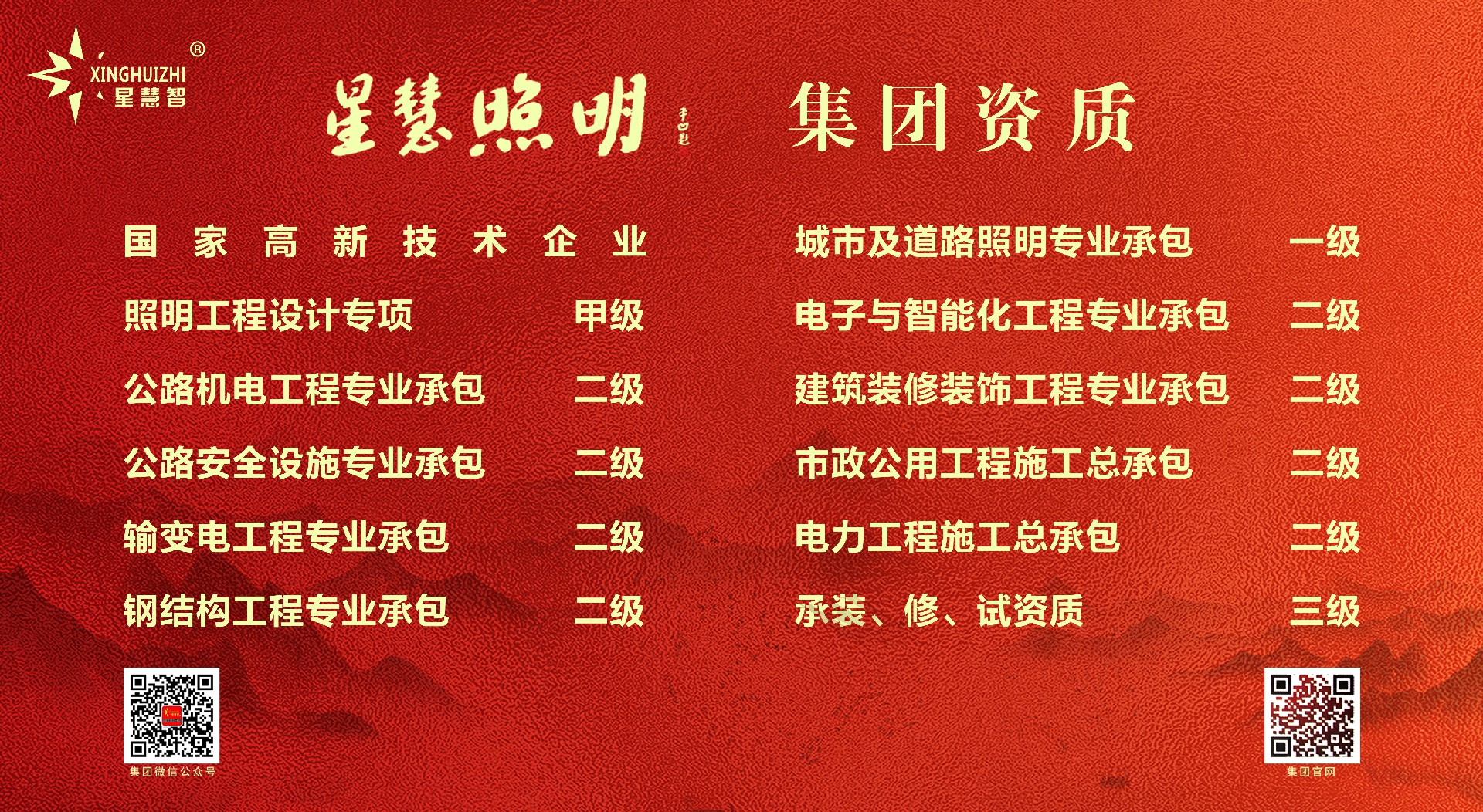 星慧照明工程集團有限公司坐落在中國路燈制造基地:江蘇省高郵市送橋鎮(zhèn)工業(yè)集中區(qū)。公司成立于1999年,注冊資金5058萬元,廠區(qū)占地8萬多平方米,建筑面積6.5萬多平方米,主要下轄三大功能生產(chǎn)廠區(qū)和兩處商務運營中心及集團行政總部,是一家集科研、設計、生產(chǎn)、銷售、施工服務為一體的大型戶外照明產(chǎn)品制造商和集成運營商。星慧照明工程集團資質(zhì)實力雄厚,目前擁有“城市及道路照明專業(yè)承包一級資質(zhì)”、“照明工程設計專項甲級資質(zhì)”、“電子與智能化工程專業(yè)承包二級資質(zhì)”、“公路安全設施專業(yè)承包二級資質(zhì)”、“公路機電工程專業(yè)分項承包二級資質(zhì)”、“建筑裝修裝飾工程專業(yè)承包二級資質(zhì)”、“市政公用工程施工總承包二級資質(zhì)”、“鋼結(jié)構工程專業(yè)承包二級資質(zhì)”、“電力工程施工總承包二級資質(zhì)”、“輸變電工程專業(yè)承包二級資質(zhì)”、“承裝(修、試)”三級資質(zhì)。公司榮幸被評為省重合同守信用企業(yè)、省質(zhì)量信得過企業(yè)、AAA級資信企業(yè),并成功通過ISO9001:2015質(zhì)量體系認證、ISO14001:2015環(huán)境體系認證、“CE”認證及“CCC”及“CQC”國家強制性產(chǎn)品認證、中國節(jié)能產(chǎn)品認證。公司成立江蘇省研究生工作站,并先后榮獲江蘇省名牌產(chǎn)品、省著名商標、高郵市市長質(zhì)量獎、揚州市百強民營企業(yè)等榮譽證書,被江蘇省認定為企業(yè)技術中心,并順利通過安全生產(chǎn)標準化二級企業(yè)驗收并取得證書,為企業(yè)的跨越性發(fā)展打下健康穩(wěn)健的基礎!集團公司的產(chǎn)品主要包括:智慧路燈、道